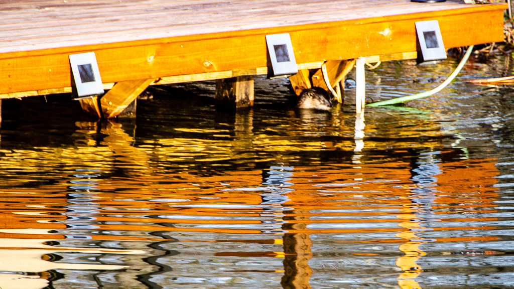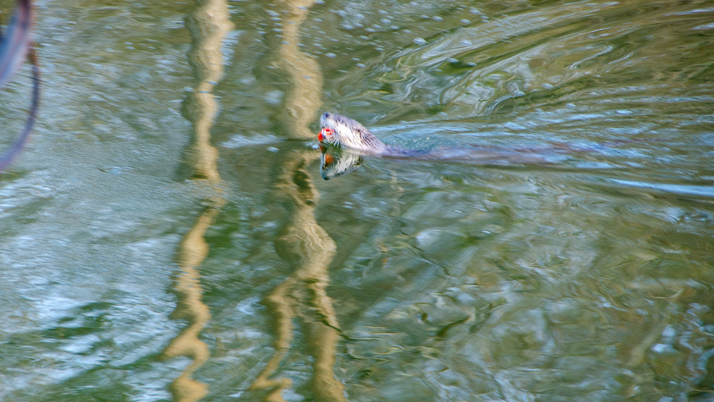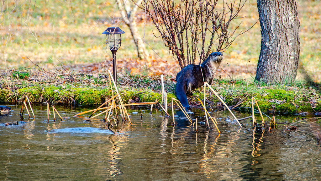 An otter and he 3 cubs fishing in the pond